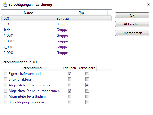 Wählen Sie den Benutzer aus, dessen Berechtigungen Sie ändern wollen. Anschließend legen Sie durch Aktivierung der Checkboxen Erlauben oder Verweigern fest, welche Berechtigungen der Benutzer erhalten soll. Mit Übernehmen werden die aktuellen Einstellungen übernommen, das Dialogfenster bleibt geöffnet. Mit OK werden die aktuellen Einstellungen ebenfalls übernommen, aber das Dialogfenster wird geschlossen.