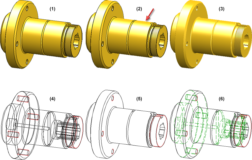 (1) Schattiert mit Kanten, (2) Schattiert ohne Lichtkanten, (3) Schattiert ohne Kanten , (4) Glasmodell, (5) Hidden-Line, (6) Hidden-Line gestrichelt