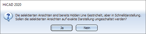 3. Sind mehrere Ansichten gewählt, die alle bereits die gewünschte Darstellung haben, sich aber in Schnelldarstellung befinden, dann fragt HiCAD, ob die Ansichten auf exakte Darstellung umgeschaltet werden sollen.
