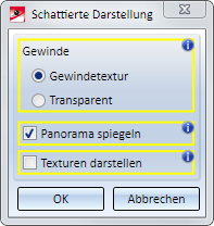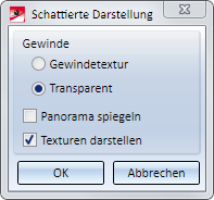 Mit dieser Funktion lässt sich für die aktive Ansicht die Darstellung von Gewinden ändern sowie die Panoramaspiegelung und die Sichtbarkeit von Texturen ein-/ausschalten. Dazu wird das Fenster Schattierte Darstellung angezeigt.