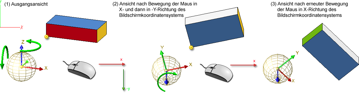 Im Beispiel ist die Ausgangsansicht (1) durch Bewegung der Maus in X- und dann in Y-Richtung (bezogen auf das Bildschirmkoordinatensystem) um die Z-Achse (Achse mit größten Steigung) gedreht und gegenüber der Bildschirmhorizontalen gekippt worden. Wird in der aktuellen Ansicht (2) erneut die Funktion Ansicht dynamisch drehen um 3D-Punkt aufgerufen, dann ist die Drehachse weiterhin die z-Achse, obwohl die Achse mit der größten Steigung jetzt die y-Achse ist. Wird nun die Maus erneut in X-Richtung bewegt, dann bewirkt dies eine erneute Drehung um die Z-Achse (3).