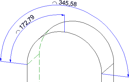 ermittelt das Bogenmaß zwischen Anfangs- und Endpunkt  eines Bogens. Die Maßhilfslinien liegen parallel zur gedachten Winkelhalbierenden des Kreissektors und beginnen an den Bogenendpunkten. Maßlinie und Bogen sind konzentrisch.