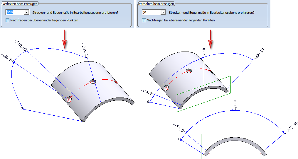 - Strecken- und Bogenmaße in Bearbeitungsebene projizieren