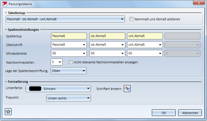 Mit dieser Funktion legen Sie die Textparameter für die Passungstabellen fest. Dazu wird das Dialogfenster Passungstabelle angezeigt.