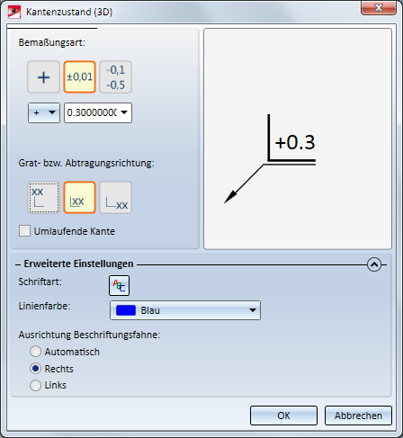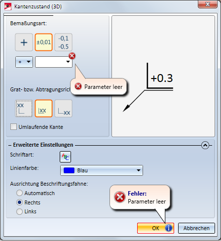 Je nach Bemaßungsart ist die Angabe von Grenzwerten erforderlich. Diese Werte kennzeichnen in der Zeichnung die Toleranz für den Grat bzw. Kantenübergang. Fehlen diese Angaben, dann wird dies im Dialogfenster entsprechend gekennzeichnet.