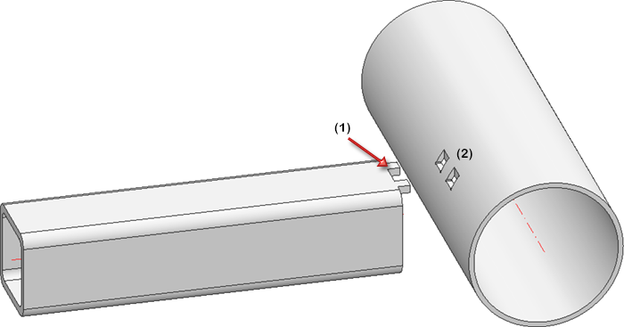Diese Funktion erzeugt an einem Teil die Bearbeitungen (2), d.h. die Bohrungen und Ausnehmungen, in die die Nocken eines Teils (1) passen.