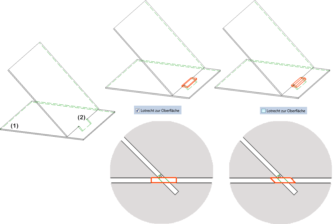 Durch Aktivieren dieser Checkbox lässt sich festlegen, dass die Bearbeitung lotrecht zur Oberfläche des Teils erzeugt wird. In der folgenden Abbildung ist im Blech (1) die Nockenbearbeitung zu Blech (2) erzeugt worden.