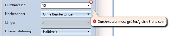 Ist ein Einbau der Nocken mit den aktuellen Einstellungen nicht möglich, dann wird dies im Dialogfenster durch das Symbol