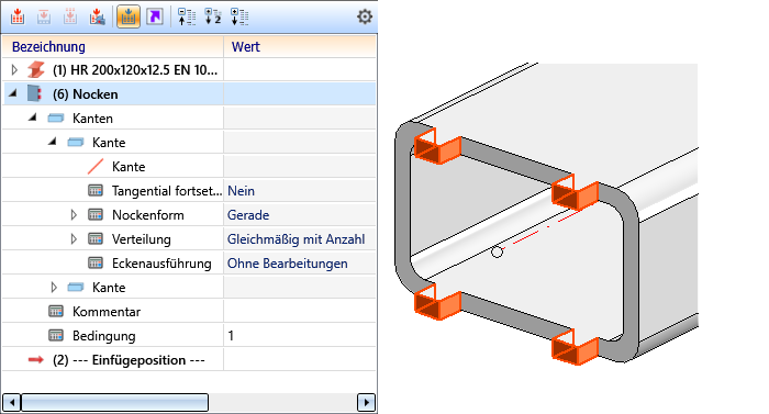 In Bereich Nockenform bestimmen Sie das Aussehen und die Größe der Nocke. Dies sind der Nockentyp, das Nockenende und die Eckenausführung.