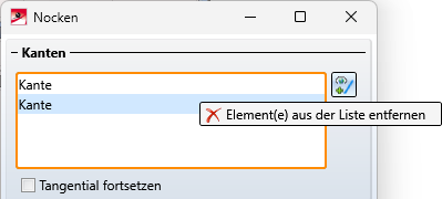 Im Bereich Kanten wählen Sie die Kante aus, an der die Nocken eingebaut werden sollen. Sie können hier mehrere Kanten auswählen, die aber zum selben Teil gehören müssen. Um eine Kante aus der Auswahl zu entfernen, klicken Sie mit der rechten Maustaste auf den entsprechenden Listeneintrag und wählen die Funktion Element(e) aus der Liste entfernen. Um nachträglich weitere Kanten zur Auswahl hinzuzufügen, klicken Sie auf