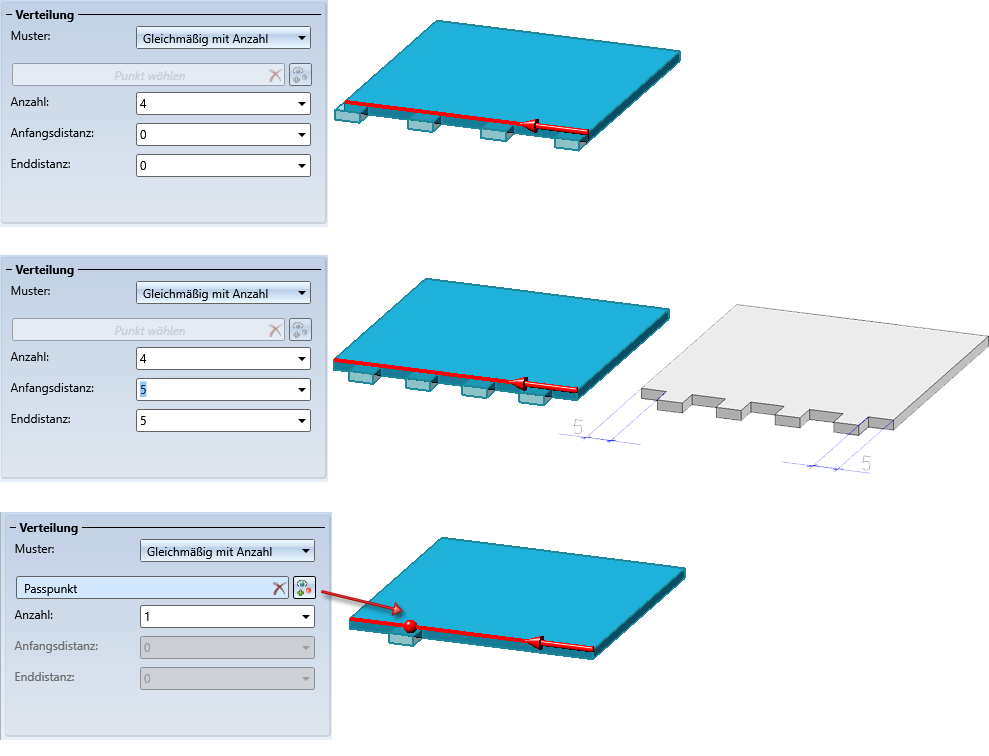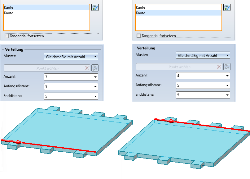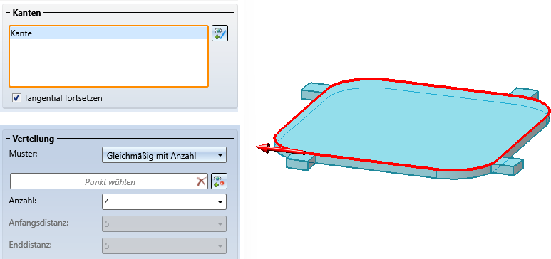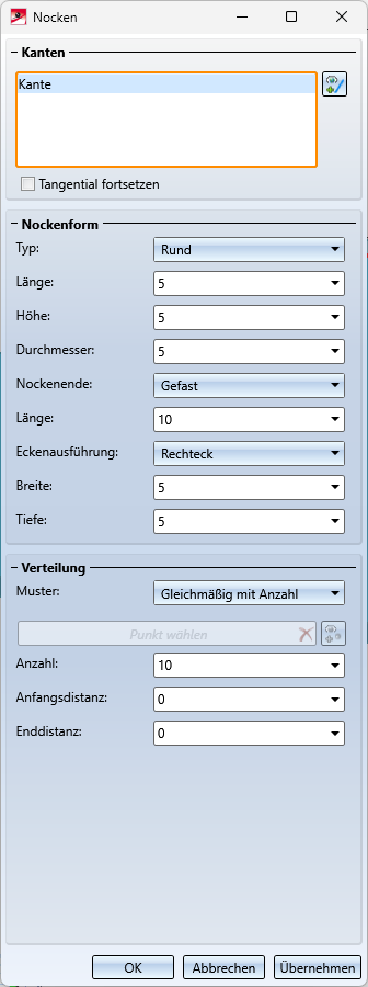 Bei diesem Verfahren werden die Nocken nach Eingabe der Anzahl gleichmäßig auf der Kante verteilt. Solange die Kanten sich nicht schließen - beispielsweise bei Kreisen oder bei tangentialer Fortsetzung - können bei einer Anzahl > 1 die Distanz der ersten Nocke zum Anfangspunkt und die Distanz der letzten Nocke zum Endpunkt der Kante angegeben werden. Wird keine Distanz eingegeben, beginnt die erste Nocke im Anfangspunkt der Kante und die letzte Nocke endet im Endpunkt der Kante. Wird nur eine Nocke eingebaut, dann liegt sie mittig auf der Kante. Sie haben aber die Möglichkeit, einen anderen Passpunkt zu wählen. Dazu klicken Sie auf