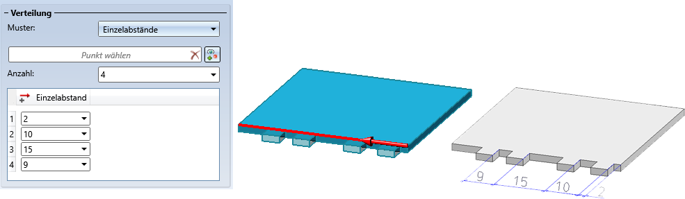Hier bestimmen Sie den Abstand der ersten Nocke zum Anfangspunkt der Kante und die Abstände vom Anfangspunkt einer Nocke zum Anfangspunkt der nächsten Nocke.