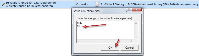 Soll dagegen bei der Gleichteilsuche auch die unterschiedliche Beschichtung der beiden Bleche berücksichtigt werden, dann müssen Sie die Einstellung im Konfigurationsmanagement unter Systemeinstellungen > Referenzierung > zu vergleichende Teileattribute bei der Gleichteilsuche beim Referenzieren entsprechend ändern, d. h. der Liste den Namen des HiCAD Attributes Beschichtung hinzufügen - also $15. (siehe auch Katalogeditor - Katalog System Einstellungen, Tabelle System Attribute). Schließen Sie den String Collection Editor anschließend mit OK.
