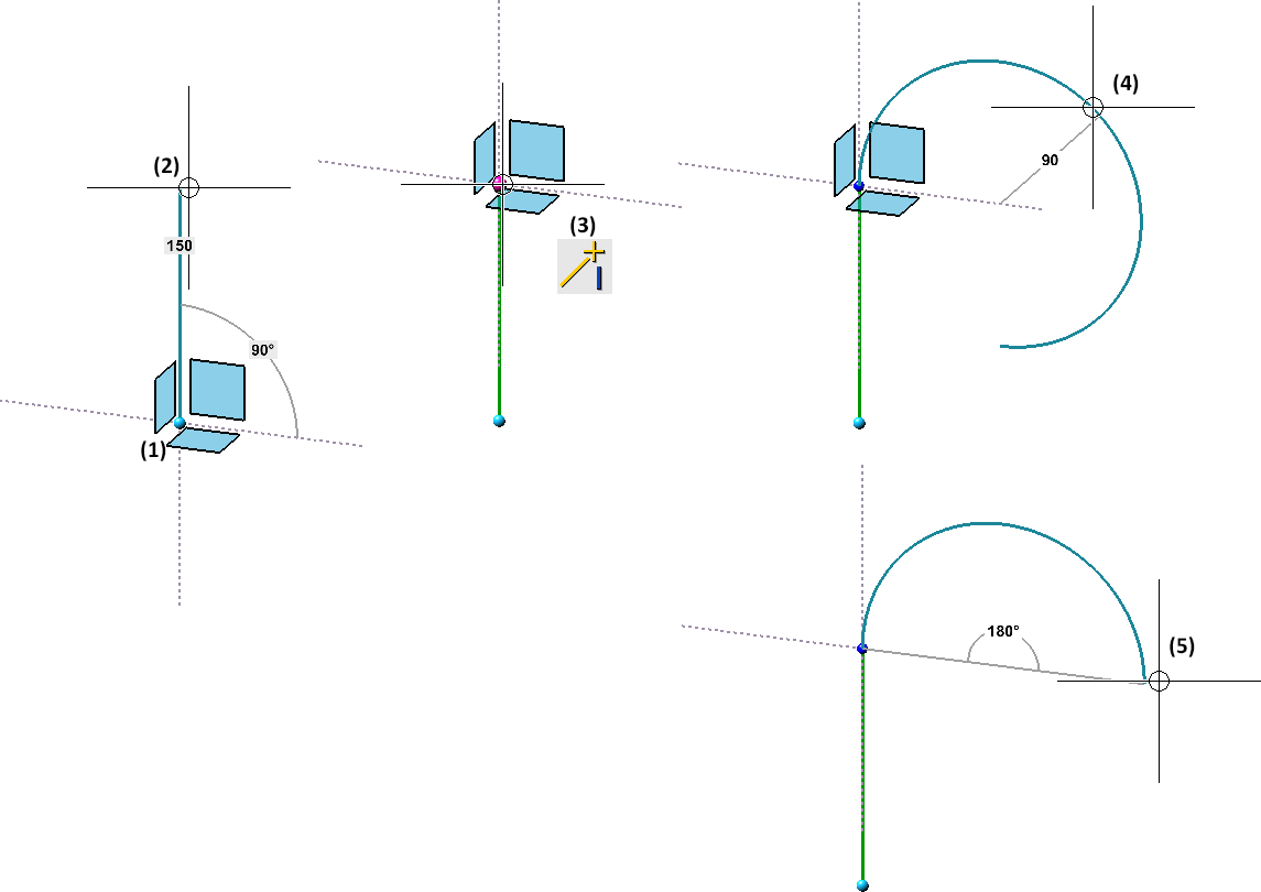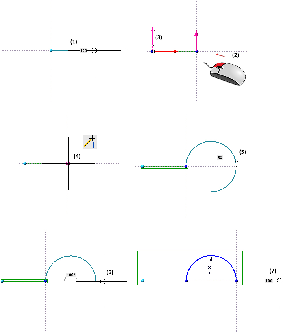 (1) erste Linie, (2) RMT Richtung wählen, (3) Richtung bestimmen, (4) letzen Endpunkt wählen, (5) Bogen aufziehen, (6) Bogenendpunkt wählen, (7) nächste Linien zeichnen