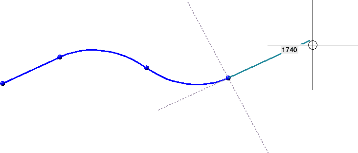 Um den Anfangspunkt der Tangente zu bestimmen, wählen Sie einen Punkt oder eine Linie. Der gewählte Punkt wird anschließend durch ein blaues Punktsymbol visualisiert. Bei einer Linienauswahl ist dies der dem Klickpunkt am nächsten liegende Punkt auf der Linie. Anschließend hängt eine dynamische Vorschau der Tangente am Cursor. Sie können dann analog den Endpunkt der Tangente bestimmen. Beachten Sie dabei, dass der blau markierte Punkt nicht unbedingt der tatsächliche Anfangspunkt der Tangente ist, sondern auch - je nach Cursorbewegung - die Projektion dieses Punkt in die Skizzenebene oder der nächstgelegen Tangentialpunkt sein kann.