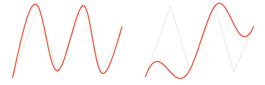 links: B-Spline, rechts: Der B-Spline-Kurve sind an den markierten Punkten Gewichte zugeordnet worden. Das Ergebnis ist eine NURB-Kurve.