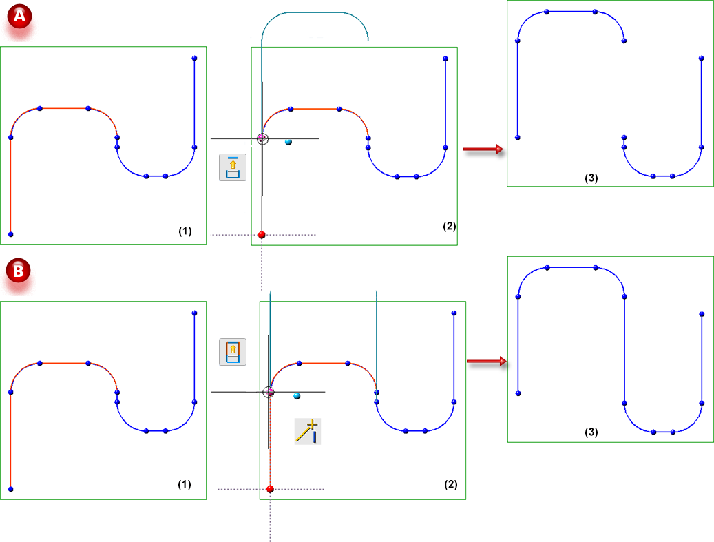 A: Linienelement einzeln, B: Verbundene Linien beibehalten und Länge anpassen, (1) Gewählte Linien, (2) gewählte Richtung, (3) Ergebnis