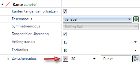 Einträge für Zwischenradien beim variablen Fasen lassen sich durch einen Klick auf das Symbol entfernen.
