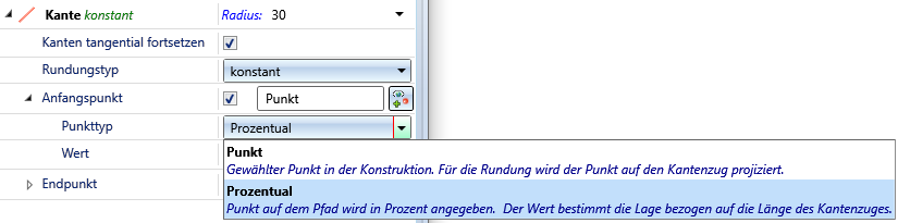 Um den Anfangs- oder Endpunkt mit einer Punktoption zu bestimmen, klicken Sie auf das Symbol und bestimmen den Punkt in der Konstruktion. Dieser muss nicht auf der gewählten Kante liegen, sondern wird automatisch auf die gewählte Kante projiziert. Als Punkttyp wird dann Punkt eingestellt.