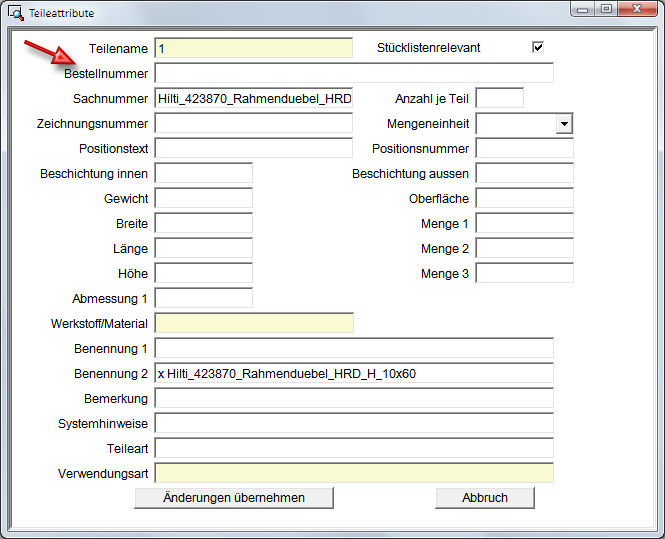 Soll die Bestellnummer auch in der Teileattribut-Maske für Normteile angezeigt werden, dann müssen Sie die Systemdatei BRW_3DTEIL_NORMTEIL.HDX entsprechend erweitern.