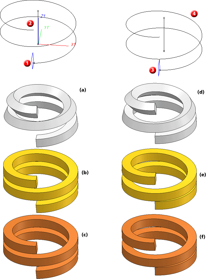 Bei unterschiedlicher Ganghöhe hat bei Konstantem Winkel mit Richtung (f) das Ende des Sweepteils den gleichen Winkel zur Leitlinie wie am Anfang, in dem die Skizze gelegen hat. (d) zeigt die Verlegung mit minimaler Rotation, (e) die Verlegung mit Richtungsvorgabe.