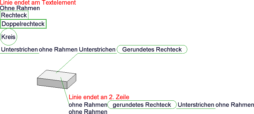 Die komplette Beschriftung kann mit oder ohne Rahmen sowie unterstrichen, d. h. mit einer verlängerten Textfahne, erstellt werden. Als Rahmen sind Rechtecke, Rechtecke mit Doppellinien sowie Kreise möglich.