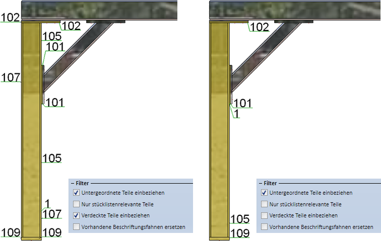 bestimmt, ob nur die stücklistenrelevanten Teile der Auswahl beschriftet werden oder alle. - Verdeckte Teile einbeziehen