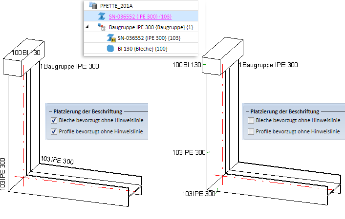 Hier haben Sie die Möglichkeit festzulegen, ob die Beschriftung von Blechen und Profilen bevorzugt ohne Hinweislinie erfolgen soll.