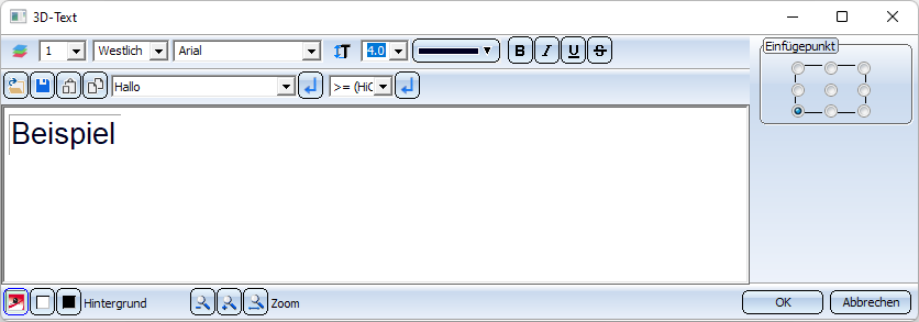 Zur Eingabe von 3D-Texten wird das Dialogfenster Text angezeigt mit folgenden Eingabebereichen und Funktionen:
