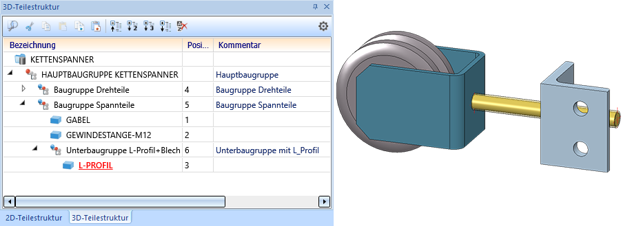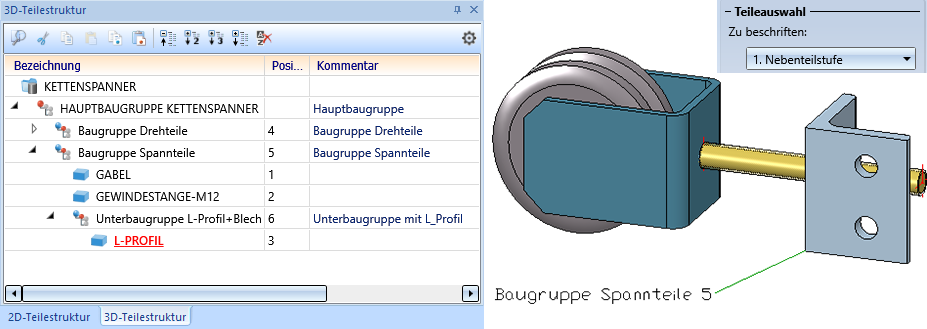 Ist diese Option aktiv, dann wird immer nur die 1. Nebenteilstufe beschriftet. Das heißt: Wird ein Teil ausgewählt, wird automatisch das höchste übergeordnete und stücklistenrelevante Teil in der ersten Nebenteilstufe gesucht und beschriftet. Dies kann insbesondere in komplexen Konstruktionen hilfreich sein, wenn nur die Baugruppen beschriftet werden sollen. Ein Beispiel: Wir betrachten die abgebildete Konstruktion.
