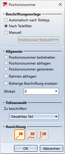 Hier können Sie explizit eine Beschriftungsvorlage auswählen, z. B. PosNummerSTB.ftd für den Stahlbau. - Teilefilter