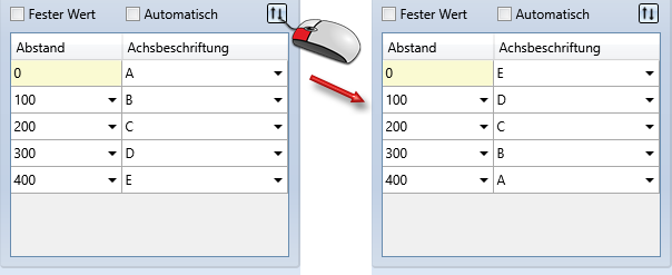 Es wird immer eine Achsbeschriftung erzeugt; ist die Checkbox Automatisch aktiv, dann können Sie im Feld darüber einen den Startwert für eine fortlaufende Achsenbeschriftung angeben. Soll die Beschriftung nicht fortlaufend erfolgen, muss die Checkbox deaktiviert und die Achsenbeschriftung direkt in der Tabelle eingetragen werden.