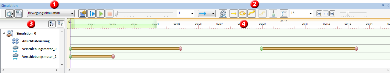 In der Zeitleiste wird angezeigt, in welchen Zeiträumen Motoren und Ansichtsverläufe wirkt. Diese Zeiträume werden über Schalter definiert. Bei Motoren markieren grüne Schalter den Anfang eines Zeitraums, rote Schalter das Ende eines Zeitraums.