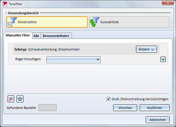 Aktivieren Sie die Funktion Teilefilter in der transparenten Symbolleiste. Wählen Sie unter Manuelle Filter die Teiletypen Schraubverbindung und Einzelnormteil