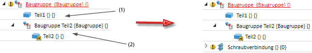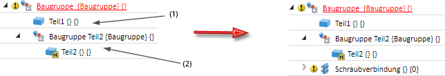 Bei der komprimierten Darstellung ändert sich auch die Anzeige der Verschraubung in der Teilestruktur des ICN.