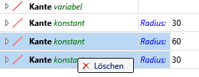 Wenn Sie in der Konstruktion eine Kante oder Fläche wählen, die in der Liste der Rundungselemente bereits enthalten ist, dann wird der Eintrag aus der Liste entfernt!