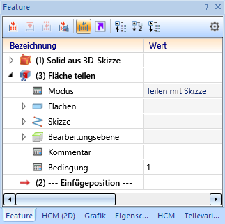 Für jede Teilung wird ein Feature mit dem Namen Fläche teilen erzeugt. Mit einem Doppelklick auf den Eintrag im Feature-Protokoll lässt sich der Funktionsdialog Fläche teilen starten, beispielsweise um die der Teilung zugrunde liegende Skizze zu bearbeiten, die Flächenauswahl zu ändern oder einen anderen Linienzug zu wählen.