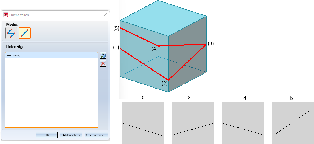 Hier wird ein Linienzug "um die Ecke" gezeichnet. Anfangspunkt einer Linie ist der Endpunkt der vorhergehenden Linie, ede der vier Linien liegt in einer anderen Ebene. Die Teilung wird durchgeführt. Der Linienzug teilt hier in einem Schritt die Vorder- (a) und Rückseite (b) sowie die rechte (c) und linke Seitenfläche (d) des Quaders.