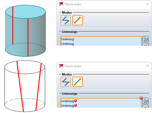 In diesem Modus werden anstelle einer Skizze Linienzüge, die stückweise aus Geraden bestehen, zum Teilen verwendet. Diese Linien müssen exakt auf der zu teilenden Fläche liegen. Dadurch wird die Fläche automatisch vorgegeben und muss nicht explizit gewählt werden. Geteilt werden können Flächen, Zylinder- und Kegelflächen.