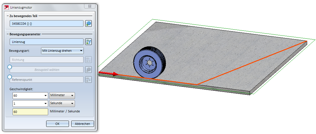 (zu bewegendes Bauteil ist das Rad, Linienzug ist die blau markierte Skizze, Richtung: Linienzug, Bewegungsart: mit Linienzug drehen, kein Referenzpunkt Geschwindigkeit: 60 mm/sec)