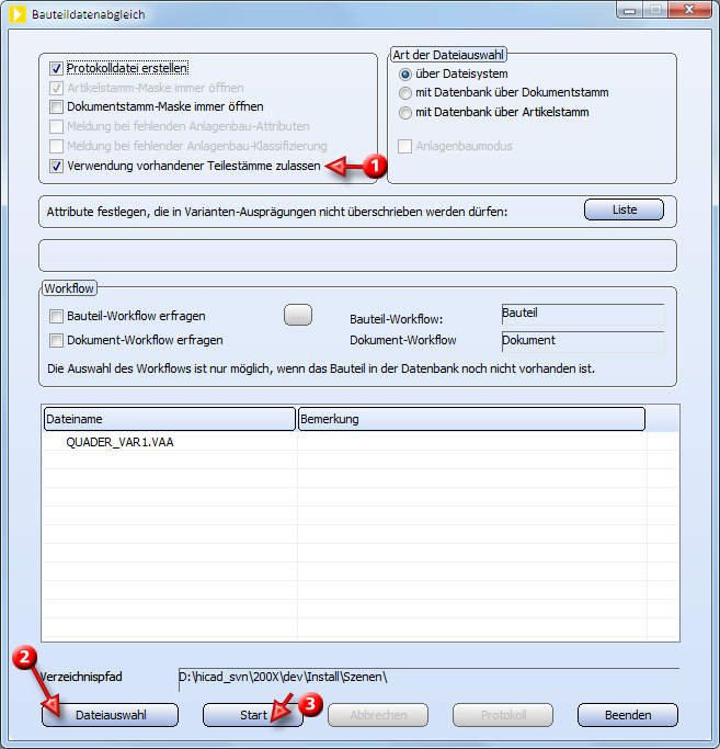 Beim Bauteildatenabgleich von Bauteil-Varianten (VAA-Dateien) mit der HELiOS-Datenbank können auch bereits vorhandene Artikelstämme verwendet werden.