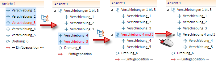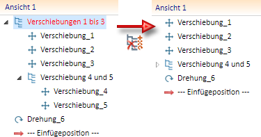 Wenn Sie eineTransformation im Explosionsprotokoll anklicken, dann wird neben dem transformierten Teil auch das Teil an seiner Originalposition (bzw. seiner vorherigen Position, falls es mehrfach transformiert wurde) markiert.