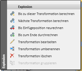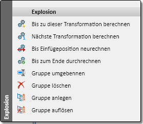 Mit den Funktionen des Menüs lassen sich Explosionen schrittweise oder komplett berechnen (z. B. nach Änderungen am Ausgangsmodell), Explosionsschritte gruppieren und Transformationen bearbeiten.