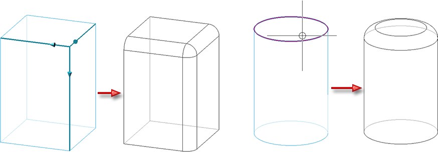 Bei Kanten wird nach der Auswahl die Kantenrichtung visualisiert. Diese hängt von der Cursorstellung bei der Auswahl ab. Beachten Sie bitte, dass die Kantenrichtung beim variablen Runden und beim Runden von Teilstücken berücksichtigt wird.