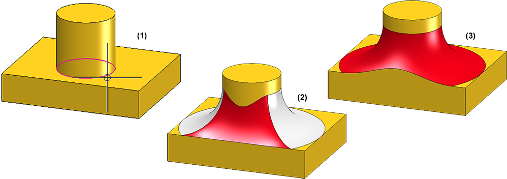 (1) Gewählte Rundungskante, (2) Kante beibehalten - es entstehen mehrere Rundungsflächen, (3) Rundungsfläche beibehalten