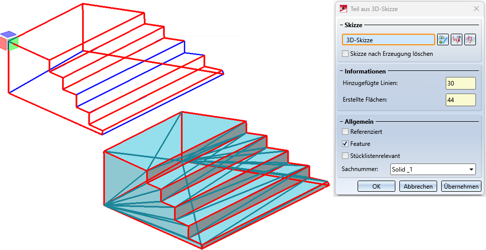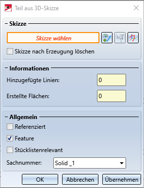 Beim Klick auf Übernehmen bleibt nach der Erzeugung des Teils das Dialogfenster geöffnet, so dass Sie ohne erneuten Funktionsaufruf weitere Teile aus 3D-Skizzen ableiten können. Mit OK wird das Dialogfenster geschlossen.