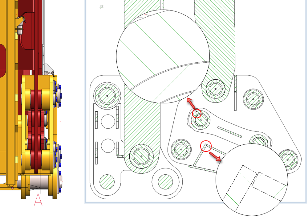 Die Abbildung zeigt eine Schnittansicht A-A mit einer daraus abgeleiteten assoziativen Detailansicht Z (1). Anschließend ist (2) ein Ausbruch in die Schnittansicht eingefügt worden (2). Dieser wird dann nach Aktualisierung (3) in die Detailansicht übernommen.