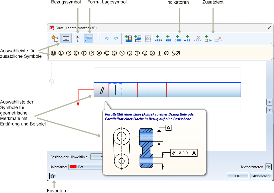 lassen sich sowohl Toleranzen mit Bezugssymbol (DIN EN ISO 5459) als auch Form-/Lagesymbole (gemäß DIN EN ISO 1101 und 14405-1) komfortabel erstellen.