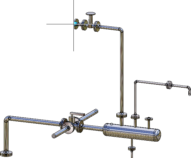 Wenn Sie den Cursor über die Rohrleitungen der Konstruktion bewegen, werden alle zulässigen Punkte der jeweiligen Rohrleitung farbig markiert (Sonderfarbe Markierung 3). Wählen Sie dann den gewünschten Punkt aus. In der Konstruktion wird nun dieser Punkt (Sonderfarbe Markierung 2) farbig markiert: