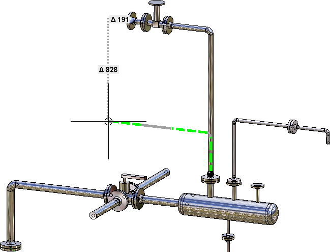 Im obigen Beispiel wurde die Funktion mit der mittleren Maustaste beendet, wobei als Zielpunkt der Verlaufsänderung ein Punkt im Raum gewählt wurde. Konkret wurde der Punkt gewählt, der mit den geringsten Änderungen am Rohrleitungsverlauf dem Sichtstrahl durch die Cursorposition am nächsten kommt. In der Regel wird man als Zielpunkt jedoch einen bereits in der Konstruktion vorhandenen Punkt wählen wollen, z. B. den Anschlusspunkt einer anderen Rohrleitung oder den Stutzen eines Behälters. Lesen Sie dazu die Informationen unter Wahl des Zielpunktes.